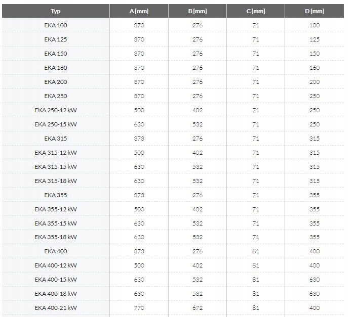 przeznaczone są do ogrzewania czystego powietrza w systemach wentylacyjnych. Obudowa (stopień ochrony EKA IP 44, z wyjątkiem EKA typ NV o stopniu ochrony IP 30) wykonana jest z odpornej na wysokie temperatury stali alucynkowej i posiada gumowe uszczelki do podłączenia do kanału. Rurka elementu grzejnego wykonana jest ze stali nierdzewnej AISI 304. W nagrzewnicach zamontowane są 2 termostaty ochronne oraz zaciski śrubowe dla łatwego podłączenia.