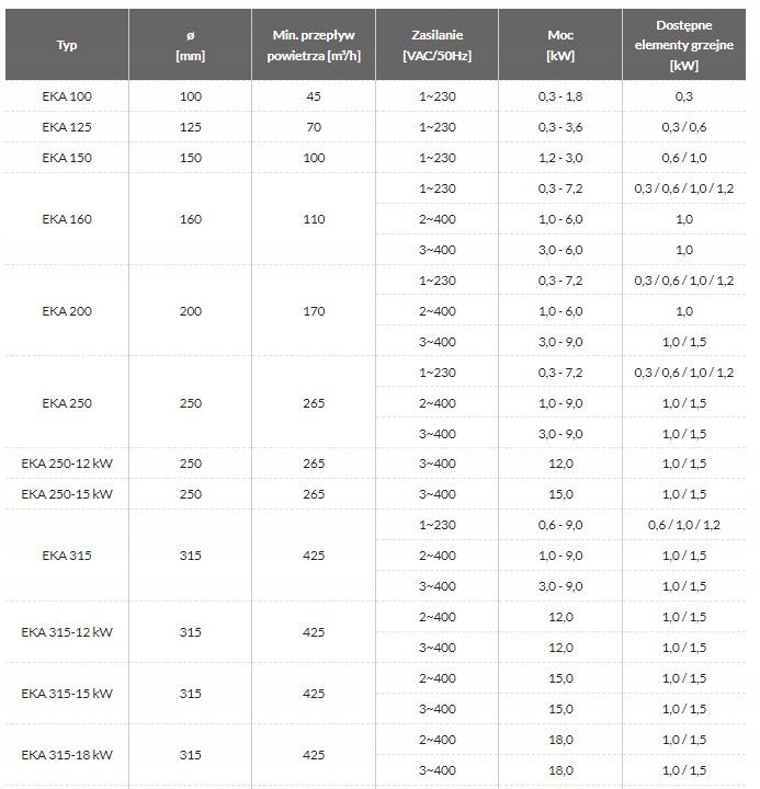 przeznaczone są do ogrzewania czystego powietrza w systemach wentylacyjnych. Obudowa (stopień ochrony EKA IP 44, z wyjątkiem EKA typ NV o stopniu ochrony IP 30) wykonana jest z odpornej na wysokie temperatury stali alucynkowej i posiada gumowe uszczelki do podłączenia do kanału. Rurka elementu grzejnego wykonana jest ze stali nierdzewnej AISI 304. W nagrzewnicach zamontowane są 2 termostaty ochronne oraz zaciski śrubowe dla łatwego podłączenia.