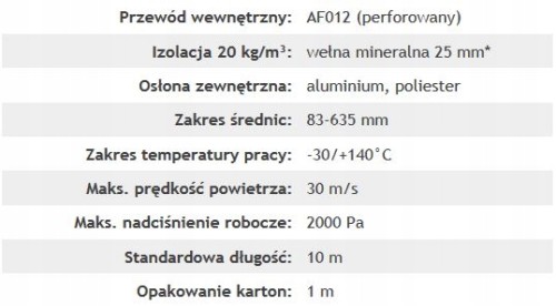 Konstrukcja: Warstwę wewnętrzną przewodu AF 019 stanowi nieznacznie perforowany przewód AF 012. Powłoką izolacyjną jest wełna mineralna, natomiast osłonę zewnętrzną stanowi trójwarstwowa powłoka z laminowanego aluminium wzmocniona włóknem szklanym.
