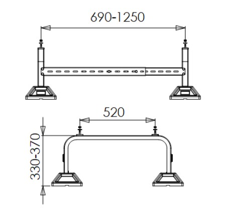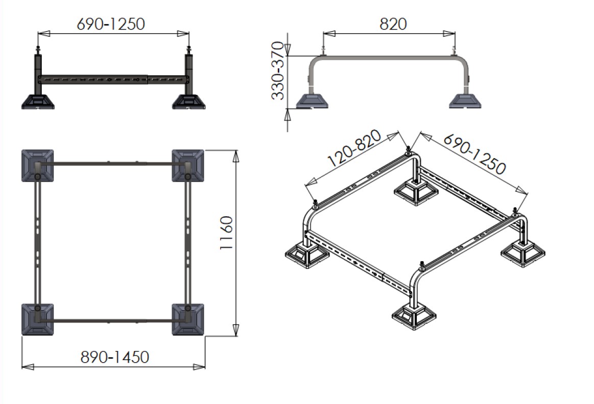 Płynna geometria montażu: Szeroki zakres regulacji poprzecznej (aż do 1250 mm) pozwala na osadzenie urządzeń o niestandardowych gabarytach, które nie mieszczą się na klasycznych podstawach.