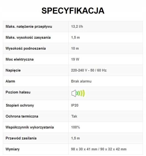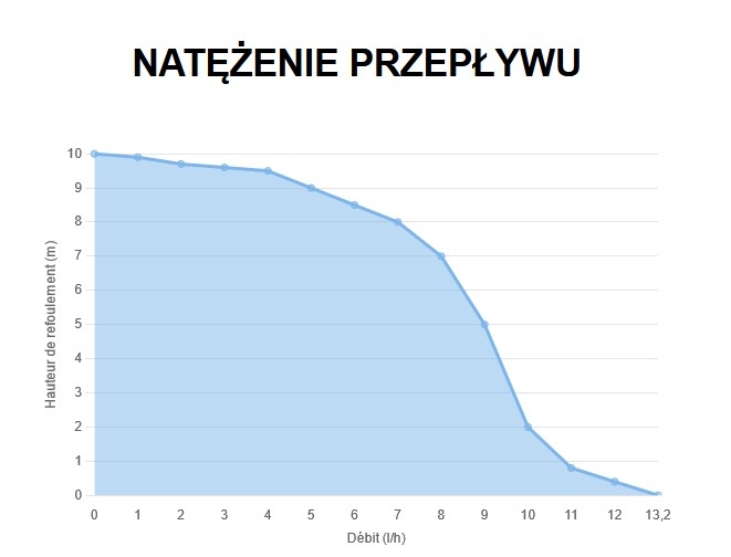 - Maksymalny przepływ [l/h] 11 (na wysokość 1m) 13,2 (na wysokość 0m)