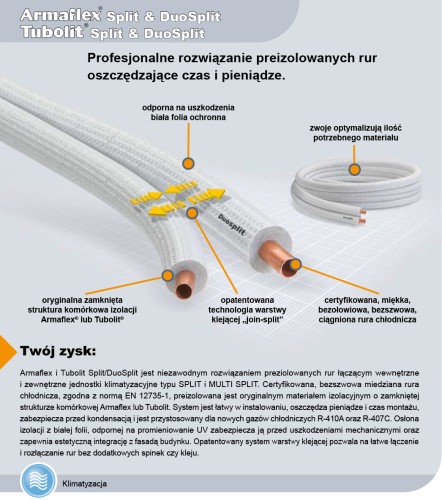 Tubolit Split/DuoSplit są niezawodnym rozwiązaniem iolowanych rur łączących wewnętrzne i zewnętrzne jednostki klimatyzacyjne typu SPLIT i MULTI SPLIT. Certyfikowana, bezszwowa miedziana rura chłodnicza, zgodna z normą EN 12735-1, zaizolowana jest oryginalnym materiałem izolacyjnym Tubolit.