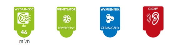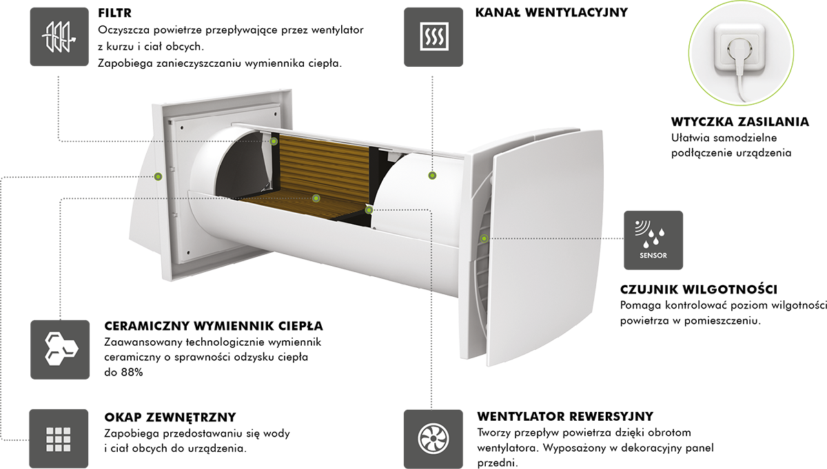 Ceramiczny wymiennik ciepła – Zapewnia wysoką sprawność odzysku ciepła do 88%. Dzięki temu, świeże powietrze napływające do pomieszczenia jest wstępnie ogrzewane przy użyciu ciepła zgromadzonego w wymienniku, co zmniejsza zużycie energii.