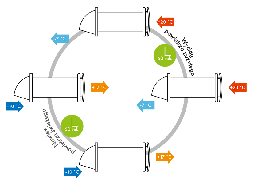 Zasada działania: Rekuperator działa w systemie dwóch 60-sekundowych cykli: