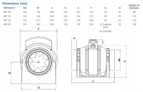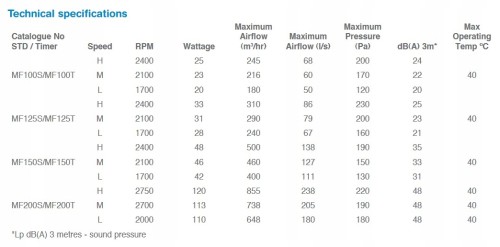 Podstawowe parametry wentylatora typu MF200S Mixflo 200