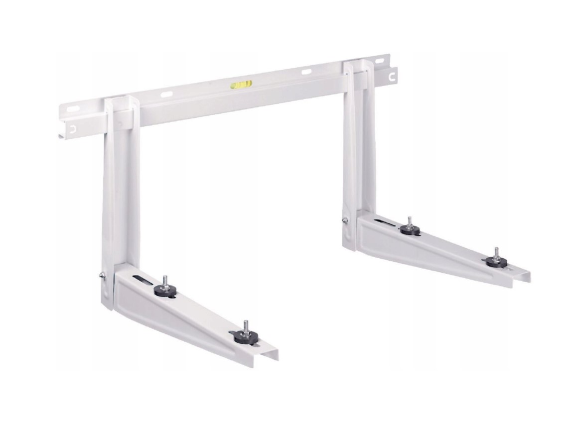 Składany wspornik do klimatyzatora włoskiej formy Rodigas wraz z belką montażową, poziomicą, kompletem wkrętów oraz śrub montażowych.