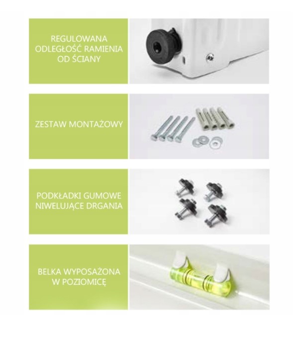 - Zestaw montażowy (poziomica, podkładki gumowe, śruby z kołkami, śruby plastikowe do ustawienia dystansu od ściany)