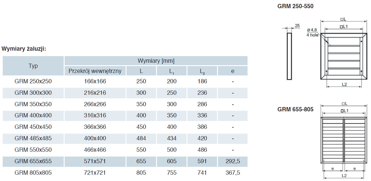 Dzięki solidnej metalowej konstrukcji i specjalnej powłoce antykorozyjnej, żaluzja GRM 550x550 zapewnia wyjątkową odporność na korozję i uszkodzenia mechaniczne. To gwarantuje jej długotrwałe i niezawodne działanie w różnych warunkach pogodowych. Jej zaawansowana konstrukcja umożliwia swobodny, grawitacyjny przepływ powietrza, co jest kluczowe dla utrzymania efektywności systemów HVAC.